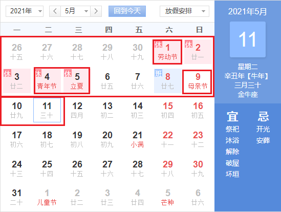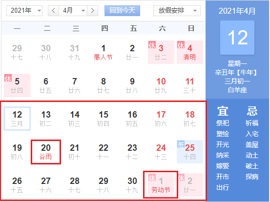 2:劳动节(2021年农历三月二十,新历2021年5月1日)